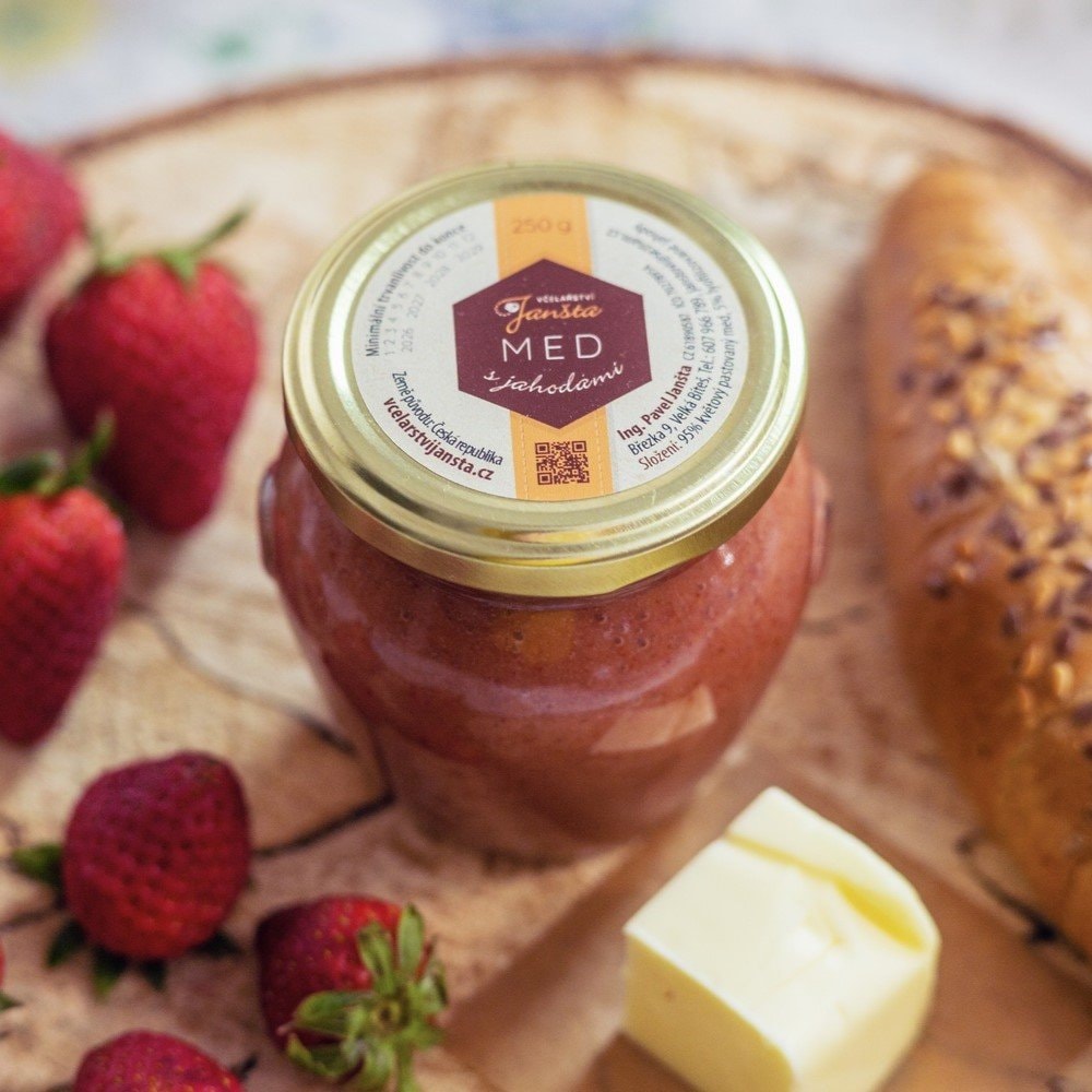 Lahodný květový med se spojil s letní chutí jahod – sladké spojení, které potěší malé i velké mlsouny.